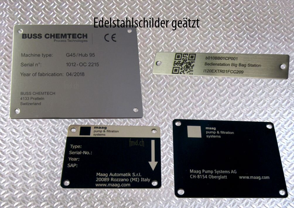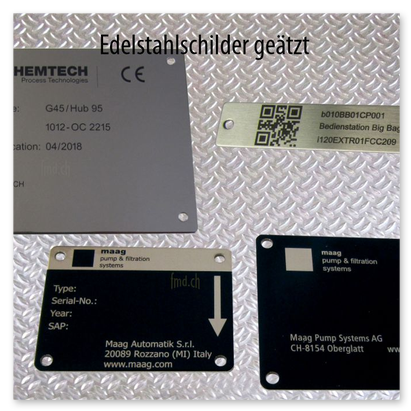 Schilder aus Edelstahl (AISI 304 oder AISI 316) geätzt können mit positiv oder auch negativ dargestellter Gestaltung gefertigt werden. Das heisst, je nach Auflage oder ob Sie wechselnden Text oder wechselnde Informationen auf die Schilder gebracht haben möchten, oder gar Barcodes, EAN Codes oder QR Codes, werden wir Ihre Schilder entweder lasergravieren oder sie werden mit dem Text/Logo etc. vertieft geätzt; Linien und Oberfläche erhaben blank oder Text und Linien erhaben blank und Grund vertieft geätzt.